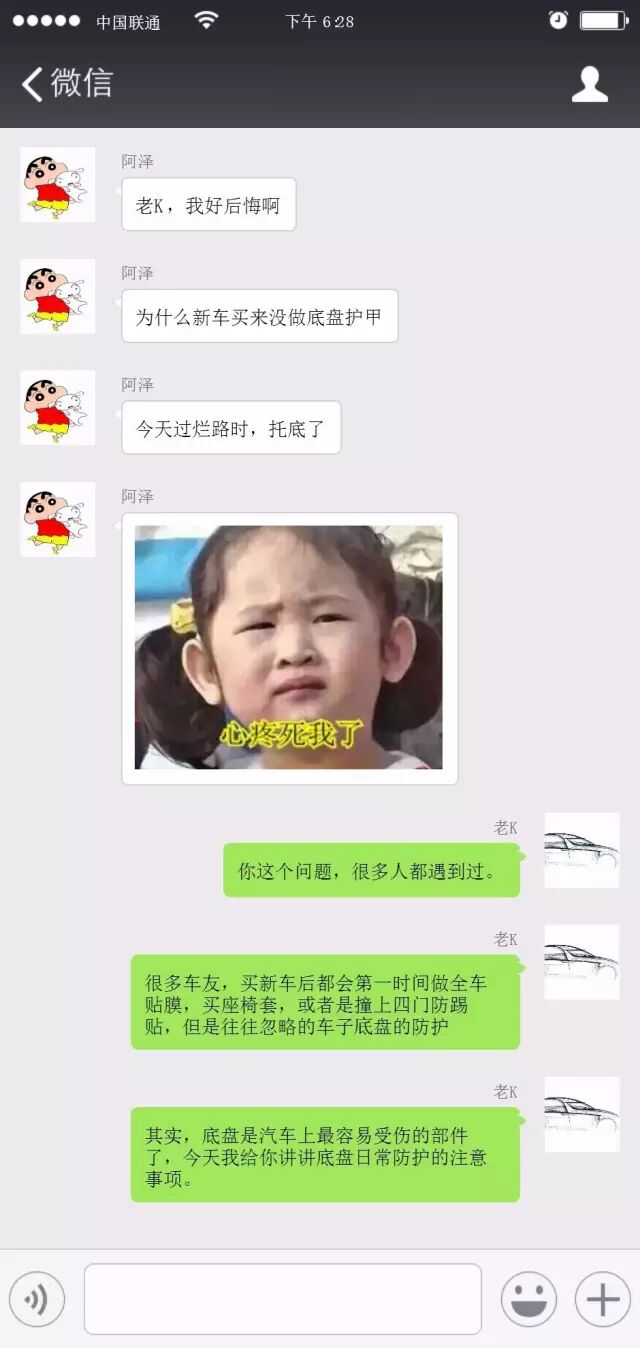 易损部件:前保险杠下端、排气管 减速带在我国的设计是没有统一标准的,形状不一,高度也不一样,主要是为了让车辆减速通过的,有些车主过减速带没减速的习惯,有些减速带的高度会比较高,所以很容易刮底了。 易损部件:前保险杠、侧裙 相信小部分的人知道,如果车子的底盘不是很高的话,通过坡顶时是很容易托底的,咣当一声,车子就卡那里了,而下坡的时候要注意减速慢行,因为前保险杠很容易碰到地面。 易损部件:轮胎壁、悬挂、前保险杠 对马路牙子的高度把握不好的话,最容易伤到的是前保险杠,方式不对还会对轮胎壁造成损坏,造成鼓包等问题出现,如果一定要上,也要让轮胎底面尽量对着马路牙子,或者找块砖头垫着,最好不要侧着上。 易损部件:油底壳、排气管 开车不集中精神的话,马路上的异物就好比暗器了,让你防不胜防,杀伤力还很大,比如大块点的石头、砖块,磕到底盘就容易造成漏油了,所以开车时要留意路面情况,及时发现异物提前躲避。 易损部件:悬挂、前保险杠 这种路面就算是SUV也是要特别小心的,比较软的路面很容易被碾压成中间高两边低的地形,你要是跟着车痕走,很容易被石头磕伤底盘、保险杠的,所以遇到这种路面最安全还是跨着走,只要侧倾角度不大,是没问题的。 易损部件:悬挂、前保险杠、轮胎 一些沥青路面或者有大货车经常走的路面最容易会形成坑洼、凹陷,从远处看并不明显,到发现时候已经来不及避让了,车速快的话简直就可以飞起来了,在不熟悉的路面就要低速慢行,注意观察路况。 易损部件:轮胎、包围 井盖是个神奇的东西,有的装配不好会凸起来,有的直接是没有了,下水道开口大又很深,一不小心陷进去,基本是开不出来了,而且包围基本是报废了。 俗话说“人老先老皮,车烂先烂底”,脸毁容尚可带个口罩出门,脚烂了就寸步难行了。底盘确保车辆和车主的安全,一旦生锈腐蚀,整车的架构将会松动,带来安全隐患。很多交通事故都由底盘松动导致。因此,防患于未然,底盘保护必不可少。 那么今天,老K就给大家讲讲底盘的保养! 1、拖底、异物撞击底盘 国内道路,今天刚修好的路明天就再次“开膛破肚”,而当路面修理的时候多数情况下都会产生比较多的大石头或者是坑坑洼洼的地方,这时候我们的车在开到这样路面的时候一不注意就会让大石头或者其他路面突出物与自己车辆的底盘进行亲密接触,也就是我们常说的拖底。 由于拖底这个情况发生具有不确定性,因此很容易给位于底盘部分的零件造成损坏,如:三元催化器外壳破碎、发动机油底壳裂纹、变速箱壳体裂纹或者是悬挂系统变形等,这些问题的发生将会给你的车带来很致命的损伤。 2、腐蚀 由于环境的愈发恶劣,有的时候连下的雨都是酸雨。而在这样的环境下我们的车则可能会增大损坏的可能。由于底盘经常会与污水、油腻等物质接触,而这些物质中的化学成分会慢慢腐蚀底盘以及底盘上的零件,因此对于底盘防腐蚀我们要更加注意。 除了刚才说的雨水、油泥会有腐蚀底盘的危险外,冬天用来融雪的融雪剂以及海水都可以腐蚀底盘,特别是海水,如果你不小心把车开到海里(机会好像不大……)或者为了撩妹带妹子看海上日出什么的,海水对底盘的腐蚀性会非常的强。如果很不注意将底盘与海水接触的话,请尽快用大量淡水或者中性清洗剂来冲刷底盘。 一般为了防止刚才两个容易导致底盘发生损坏的情况发生,建议给车安装发动机护板或者对底盘进行俗称“底盘装甲”的底盘保护。安装发动机护板这个建议老K强烈推荐,因为有些经济型轿车为了节省成本不会在发动机和变速箱下面安装保护装置,这样也就让发动机和变速箱与路面直接接触。而安装了发动机护板之后,则可以人为的将发动机和变速箱以及位于车头底盘部分的重要零件保护起来,这样即使真的发生托底情况,也会先于护板接触,而不会损伤重要零件。 1、“底盘装甲”(或称“底盘封塑”) 底盘装甲是近几年底盘保护技术。是在汽车底盘的下面喷涂一层2~4mm毫米厚的弹性密封材料。 底盘装甲可以有效防护路面砂石对底盘的击打,防止轻微的拖底磨擦;预防酸、碱、盐对底盘的腐蚀;防止底盘螺丝的松脱;降低行驶时噪音的传导,增加驾驶宁静感;阻止底盘铁板热传导,使驾驶室内冬暖夏凉。 2、发动机护板 发动机护板是根据各种不同车型定身设计的引擎防护装置,其设计首先是防止泥土包裹发动机,其次是为了行驶过程中防止由于凹凸不平的路面对发动机造成撞击而造成发动机的损坏,通过一系列设计达到延长发动机使用寿命,避免出行过程中由于外在因素导致发动机损坏的汽车抛锚。底盘损坏的原因