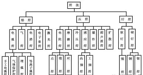常见的焊接方法有熔焊,压焊和钎焊三种,详细的分类方法如下表所示。